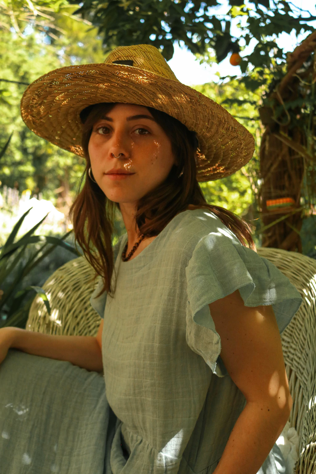 • Vestido largo de gasa doble 100% algodón con tajos a los costados, bolsillos y cuello redondo.